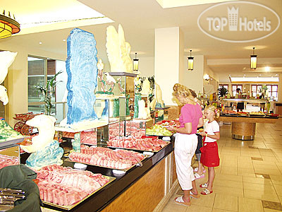 Питание в ресторане разнообразное, ассортимент блюд обширный (мясо всякое, рыба разная, полно закусок, салатов, нарезок, сладостей, варенья, кухня европейская, турецкая, на любые предпочтения, фрукты сезонные (в мае арбуз, клубника). Если кто-то жалуется на скудное меню, то, скорей всего, эти кто-то приехали в первую очередь есть, будто с голодного края.
