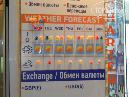 Погода: почти все 10 дней была переменная облачность, но мы успели хорошо загореть. По утрам вообще небо затянуто, а где-то к 11 пробивается солнце. По вечерам становилось прохладнее иногда я одевала джинсы и кофту. На солнце было 28 градусов.