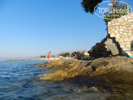 отель расположен на оживленной улице в центре Херсонисоса. Рядом- автобусная остановка, с которой можно уехать в соседние города. Мы ездили до Агиоса-Николаоса (время в пути минут 40 с остановками). вокруг множество баров , таверн, ресторанов (Средняя стоимость обеда на человека 10-15 евро.), до клубов примерно 10 -15 минут неспешным шагом. Вообще Херсонисос весь можно обойти пешком минут за 30). До моря 2 минуты пешком.Рядом есть оборудованный пляж с песчаным . пологим заходом. Лежаки/шезлонги - платно (в конце сентября стоимость была 8 евро за пару). сразу хочу предупредить о том, что пляжей с хорошим песчаным заходом в Херсонисосе оооочень мало, в основном заход в море каменистый и нужна специальная обувь!!!!Ее можно купить на курорте , либо привезти с собой.